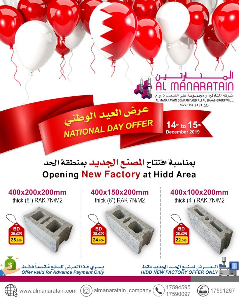 To celebrate Bahrain National Day 2019 and the opening of the new Al Manaratain block factory in Hidd, we are offering discounted rates on several concrete block products